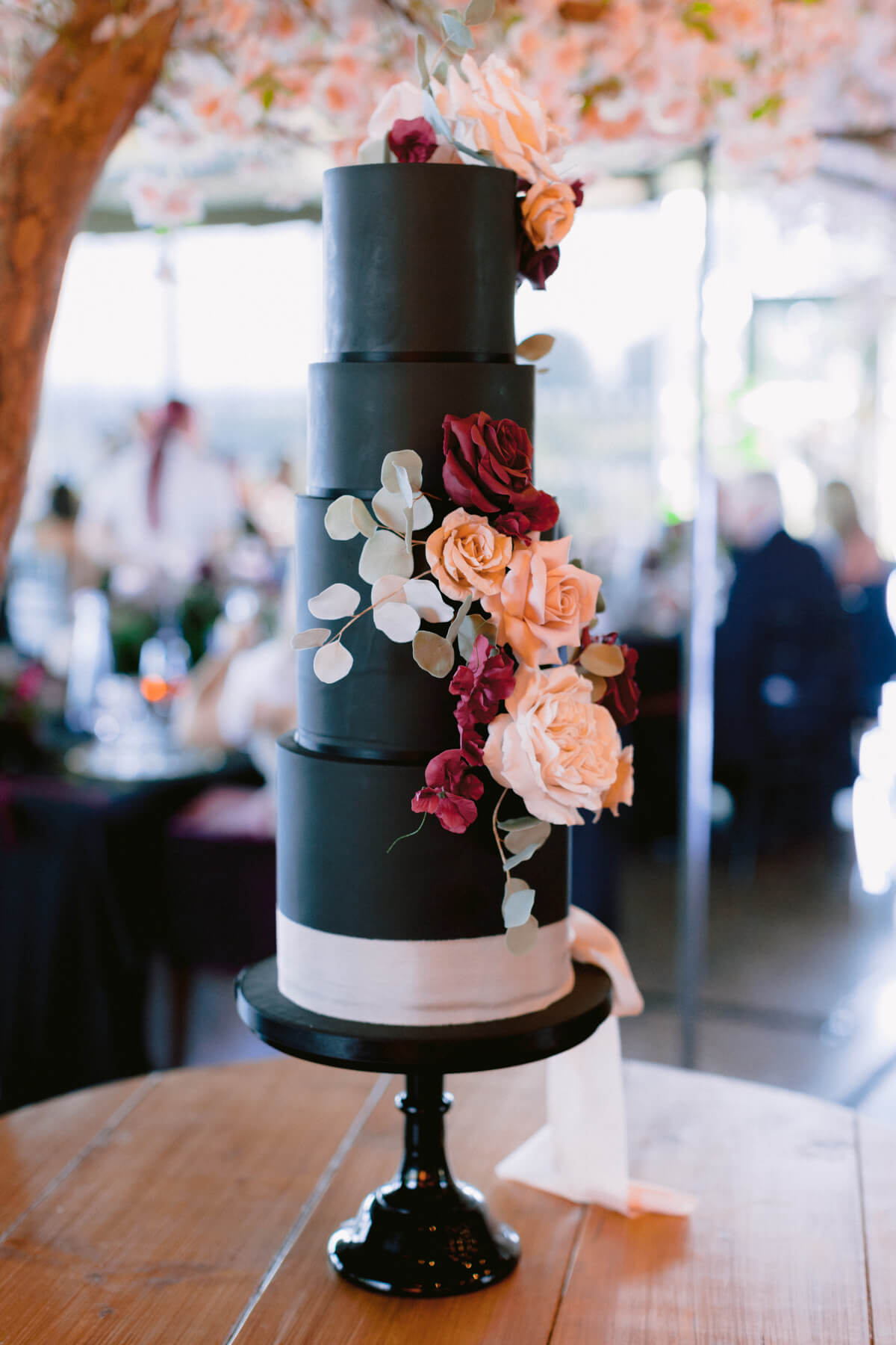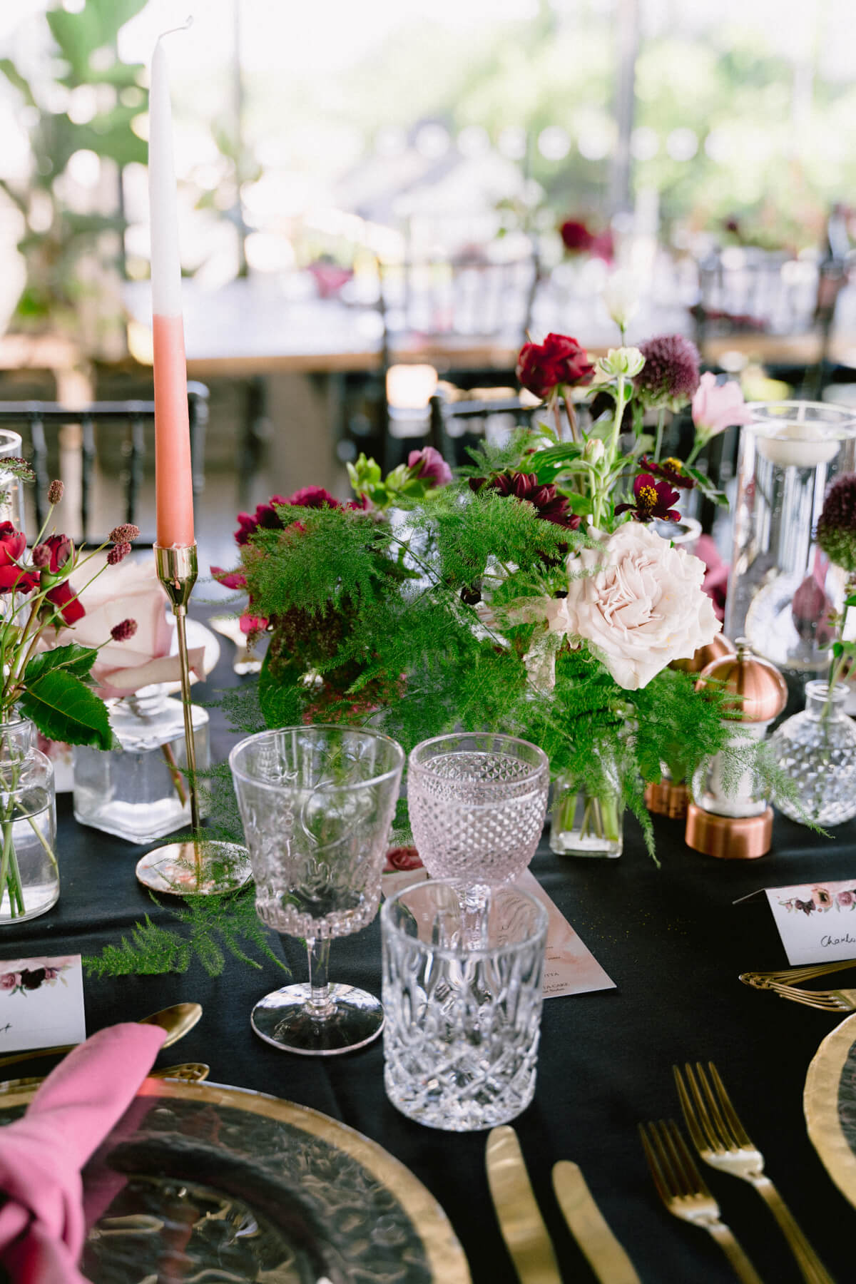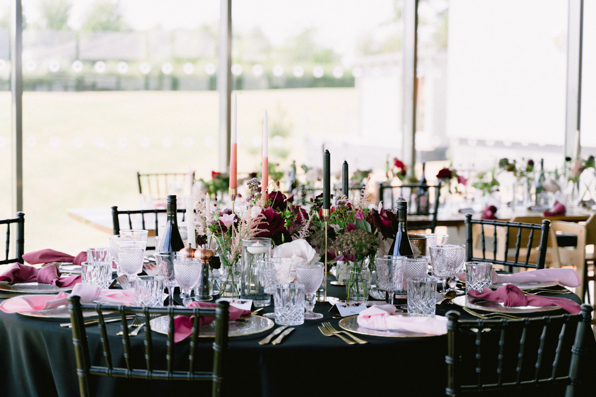 The reception was held at Hencote Vineyard, a stunning venue at the top of a hill surrounded by vineyards. The tables were elegantly set with black tablecloths, gold cutlery, clear charger plates with gold rims, and soft pink napkins, creating a stylish and welcoming atmosphere for the celebration. The florist decorated the sweetheart table with stunning floral arrangements of dark burgundy and light pink roses and plenty of greenery. The Happy Ever After lit sign was a pop-up behind the table.