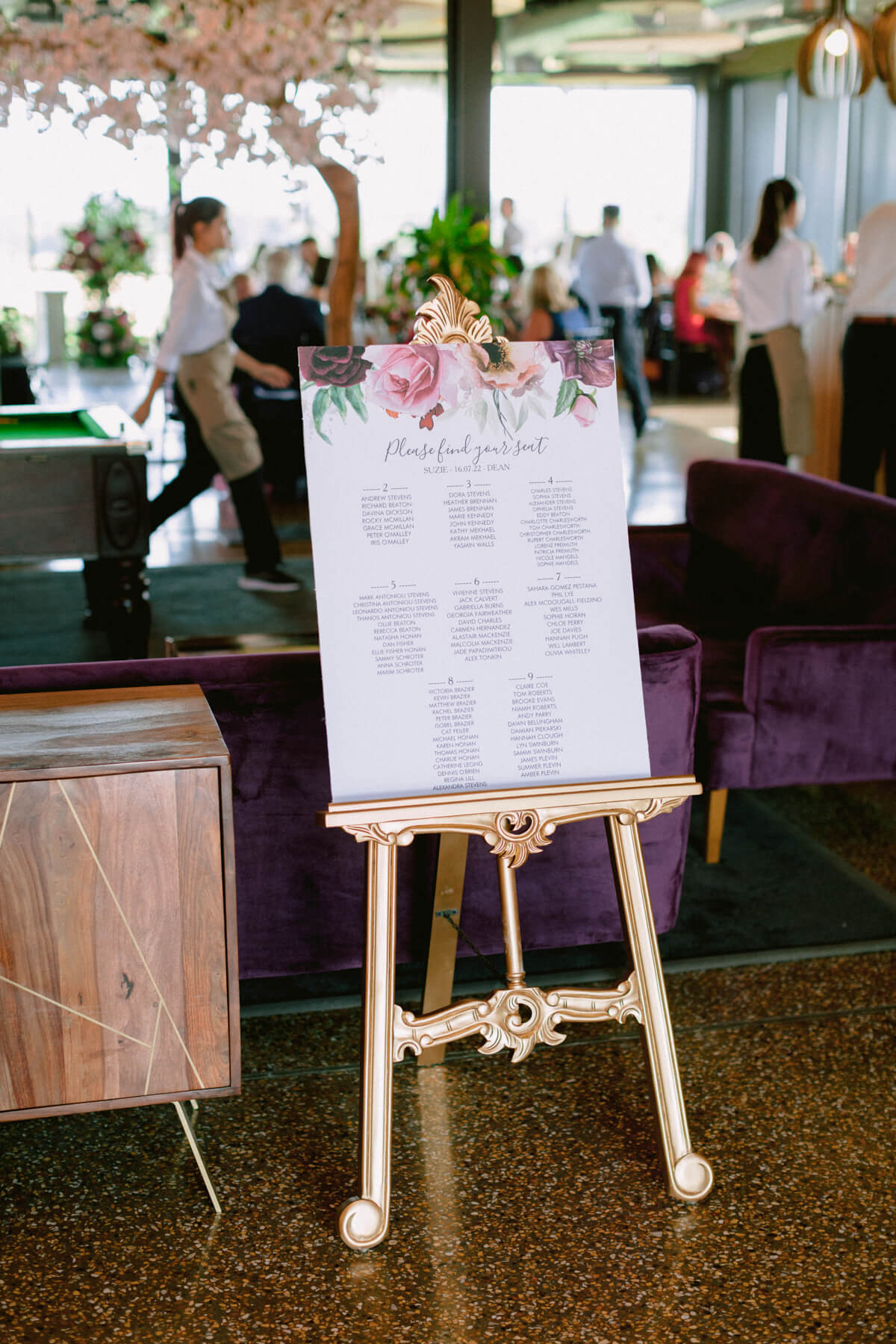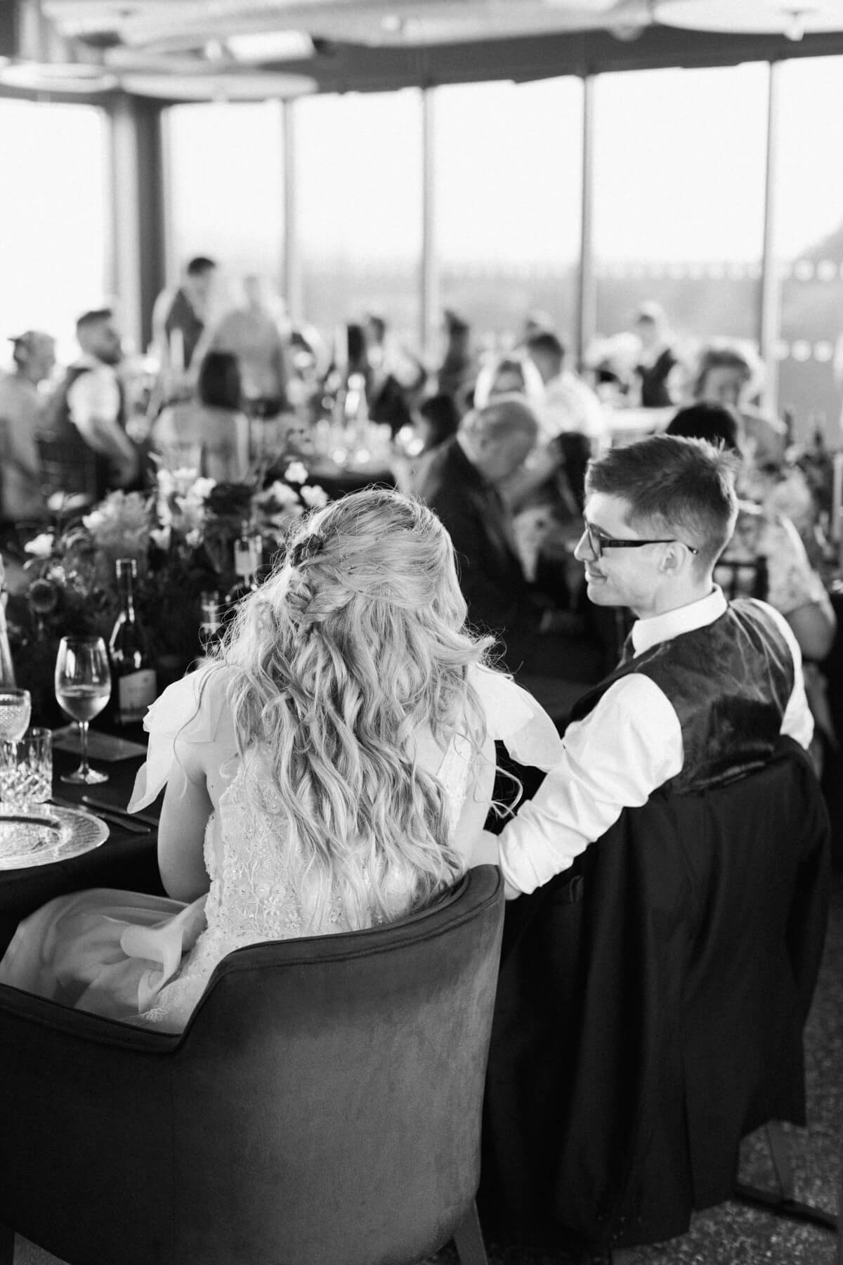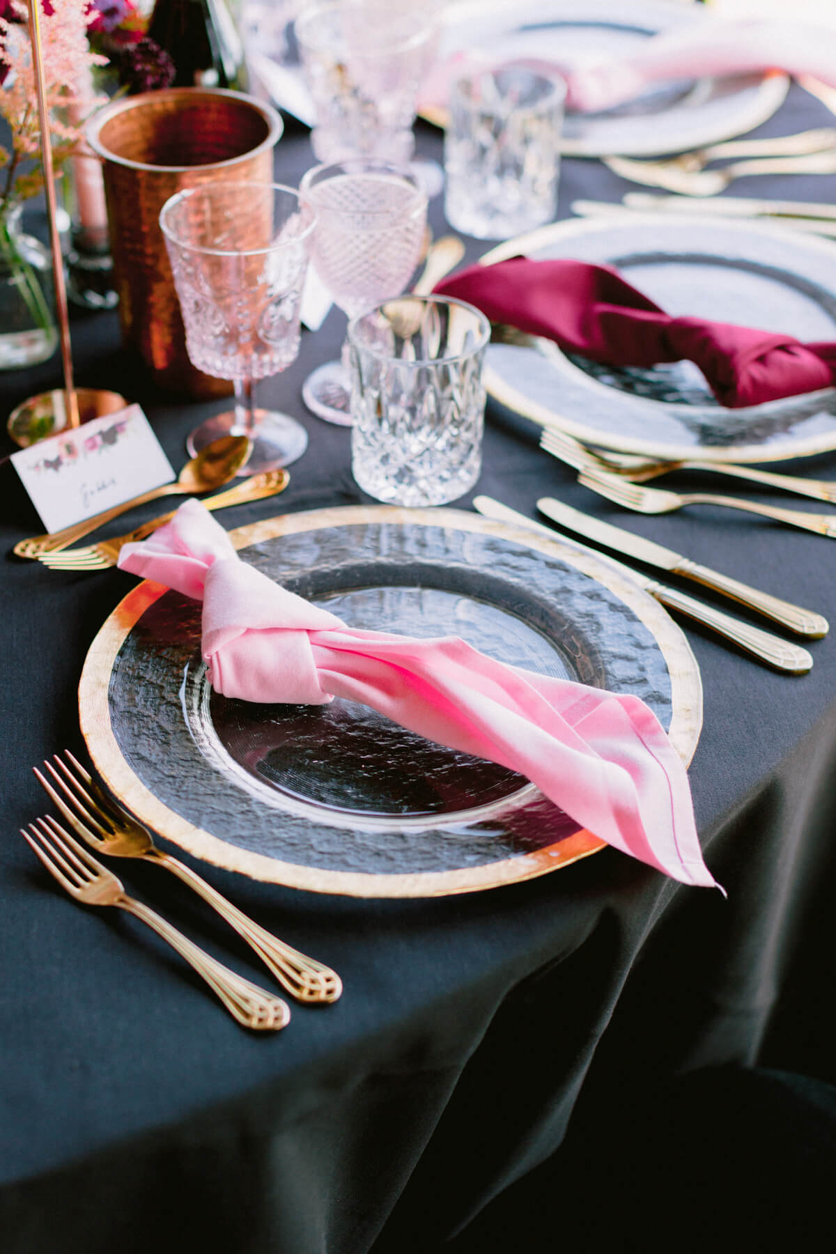 The reception was held at Hencote Vineyard, a stunning venue at the top of a hill surrounded by vineyards. The tables were elegantly set with black tablecloths, gold cutlery, clear charger plates with gold rims, and soft pink napkins, creating a stylish and welcoming atmosphere for the celebration. The florist decorated the sweetheart table with stunning floral arrangements of dark burgundy and light pink roses and plenty of greenery. The Happy Ever After lit sign was a pop-up behind the table.