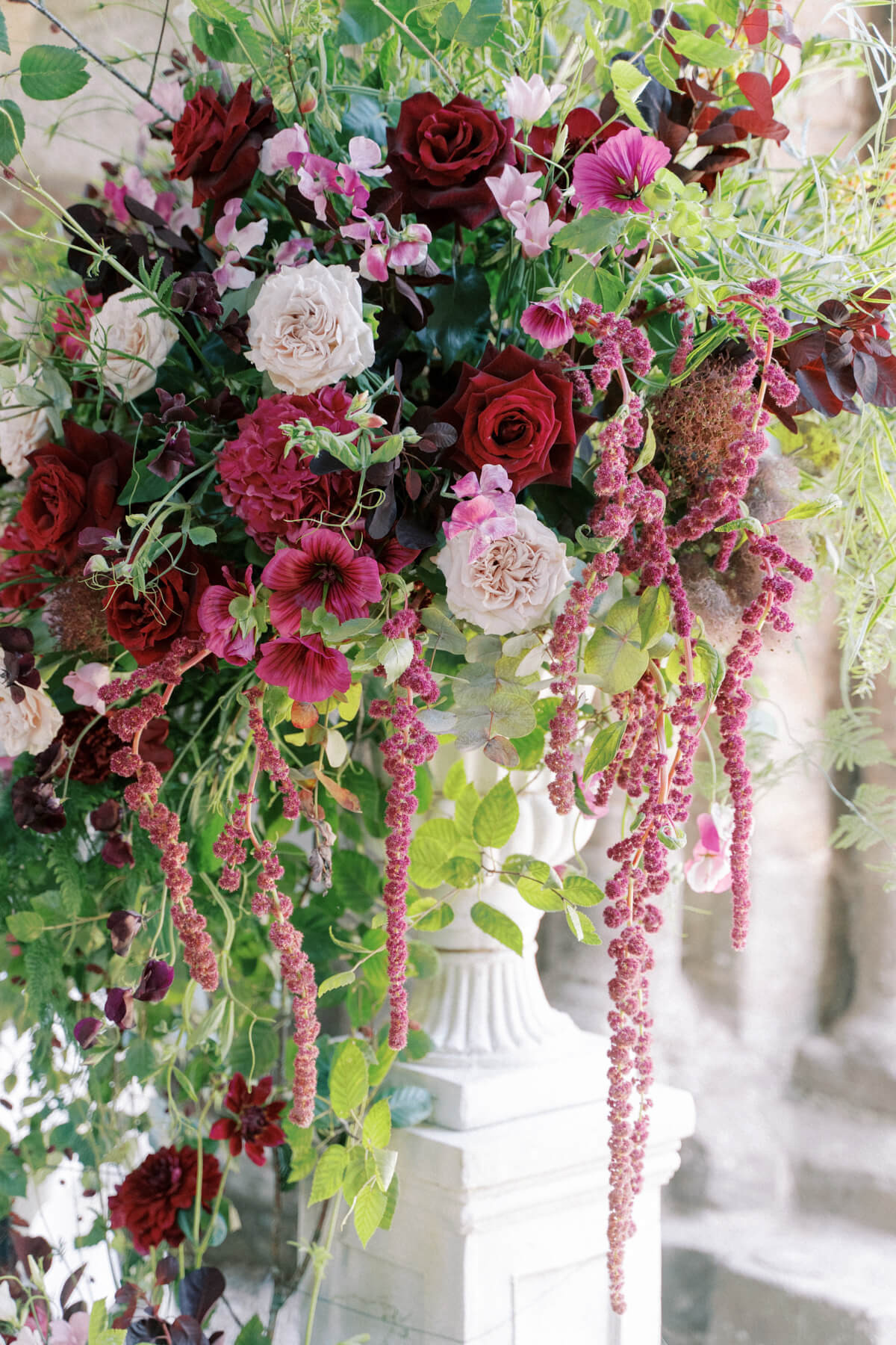 Large urn vase arrangements on tall pedestals decorated each side of the ceremony space. The beautiful florals of dark burgundy and light pink roses and hydrangeas, and a lot of greenery created a beautiful and natural look that complemented the chapel beautifully.