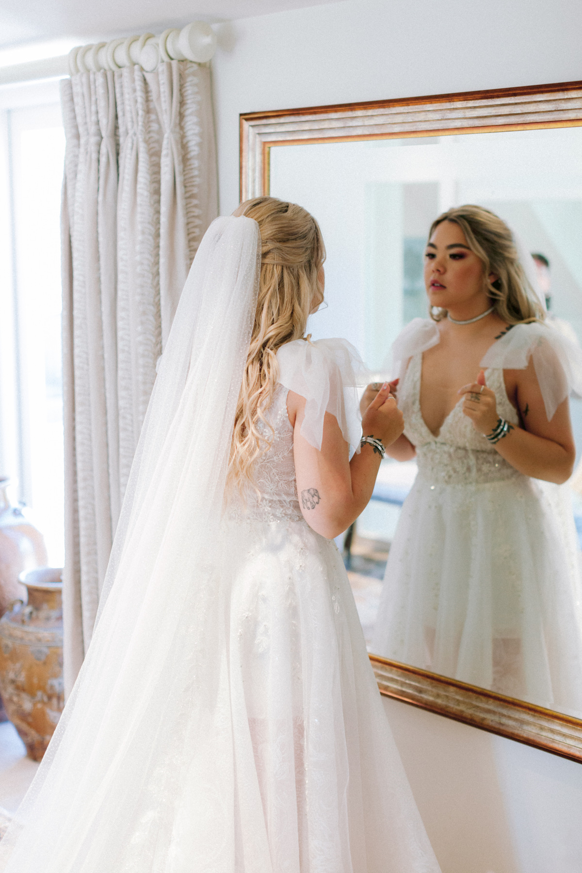 The morning was sunny and warm, and Suzie got ready at the stunning luxury guesthouse, The Grange, which is a part of Hencote Vineyard Estate. The bride’s closest friends and family surrounded her. The atmosphere was relaxed and joyful, with everyone enjoying the excitement of the wedding morning. During the wedding morning, all of Suzie’s beautiful details were photographed, including her stunning dress, shoes, jewellery, stationery, and accessories.