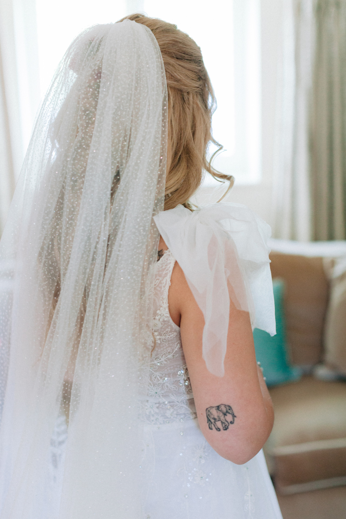 Suzie’s beautiful wedding dress by Eva Lendel was romantic yet elegant and perfect for a summer wedding. The dress was A-line, with delicate 3D flowers and shiny fabrics underneath, a deep V-neckline, a low back and a lightweight chapel-length train. The wedding dress looked perfect on her for a sunny summer wedding, and a one-tier sparkly glitter, a chapel-length veil added just the right touch and completed her bridal look so beautifully.