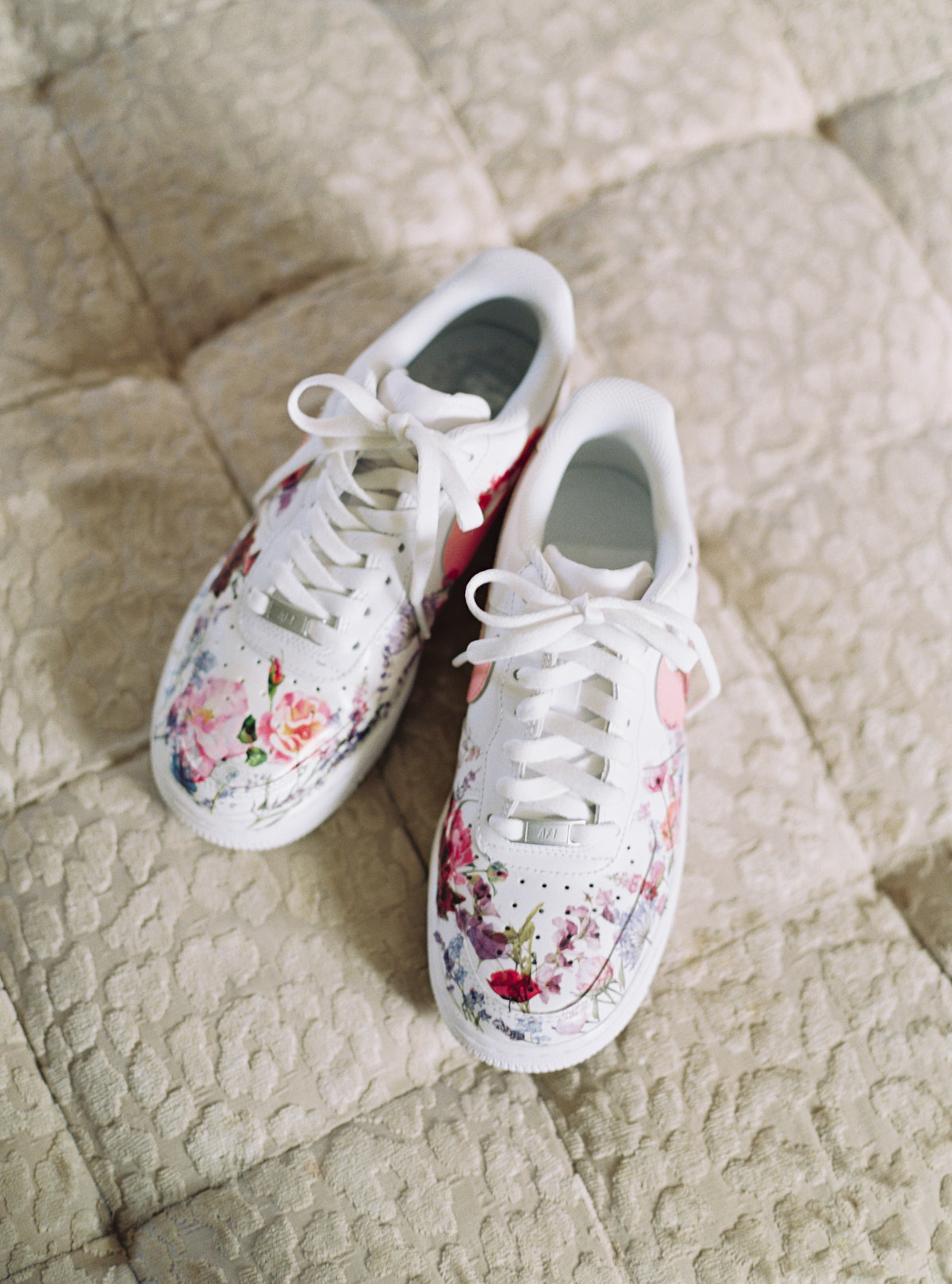 The bride wore Nike custom-painted sneakers by Sahara Gomez. Painted with delicate flowers of roses, poppies, and other wildflowers. Sneakers made her look playful, unique and different while staying comfortable the whole day.