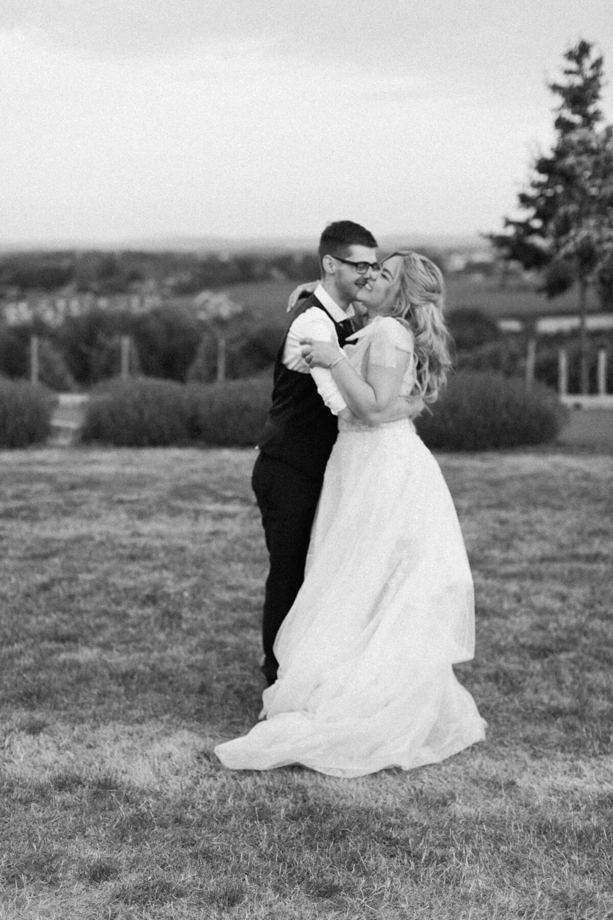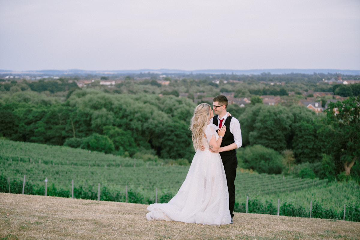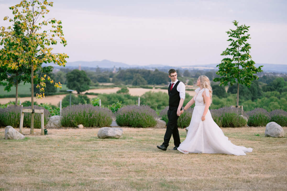 The vineyard’s private gardens, stunning view over Shropshire hills, create the perfect backdrop for romantic bride and groom portraits.